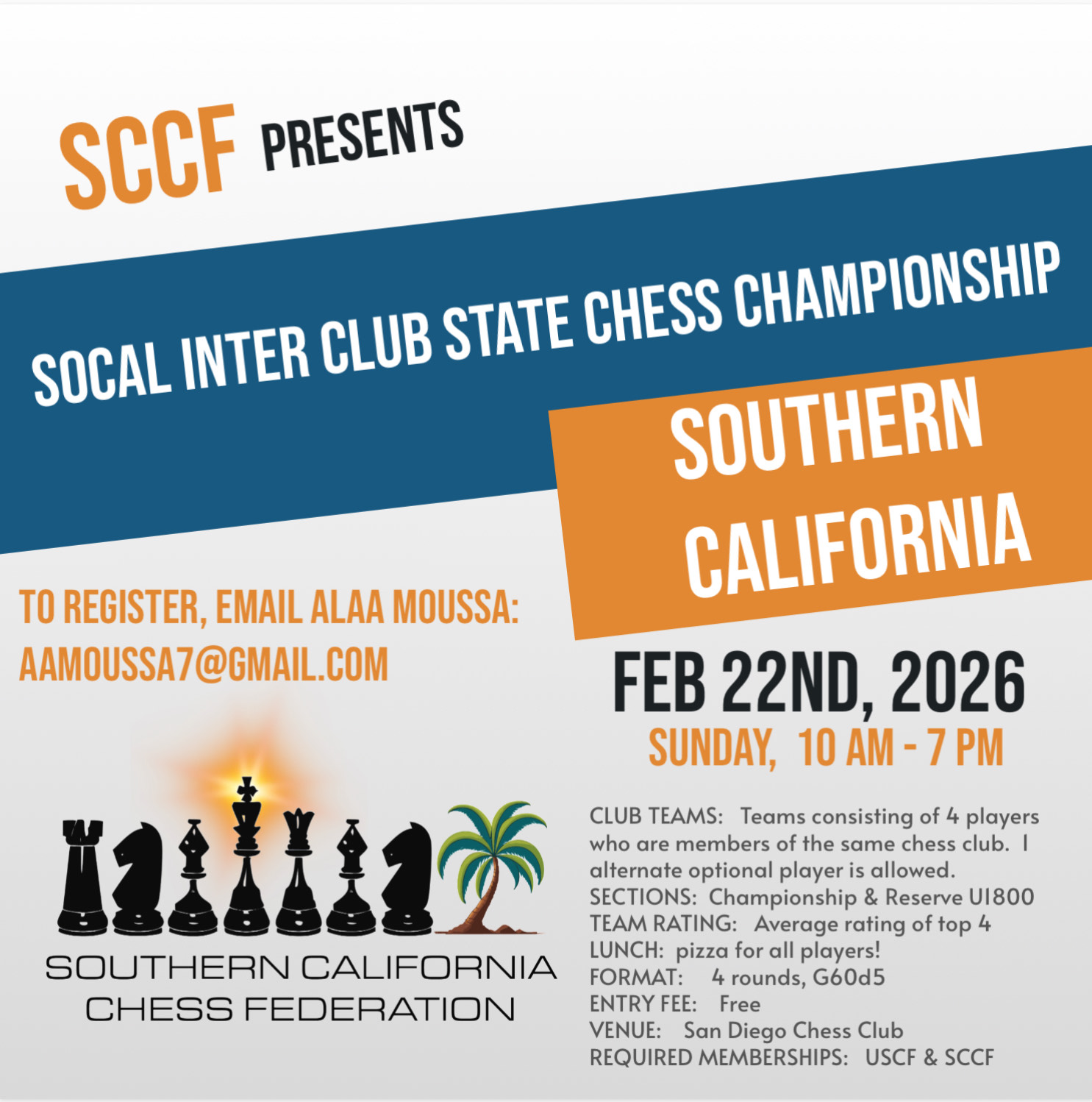Or Mail Entries to: San Diego Chess Club, P O Box 120162, San Diego, CA 92112. Flyer here.