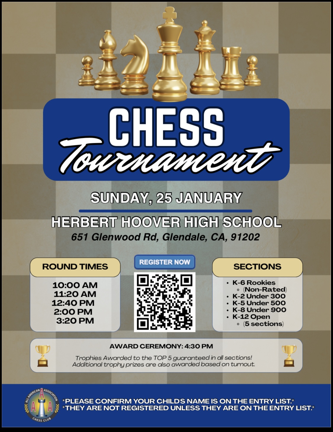 2023 SoCal SuperStates Jr. Varsity K-3 Under 500, K-6 Under 700, K-8 Under 1200, and K-12 Under 1600, plus K-1 Championship Sections. Details and registration here.